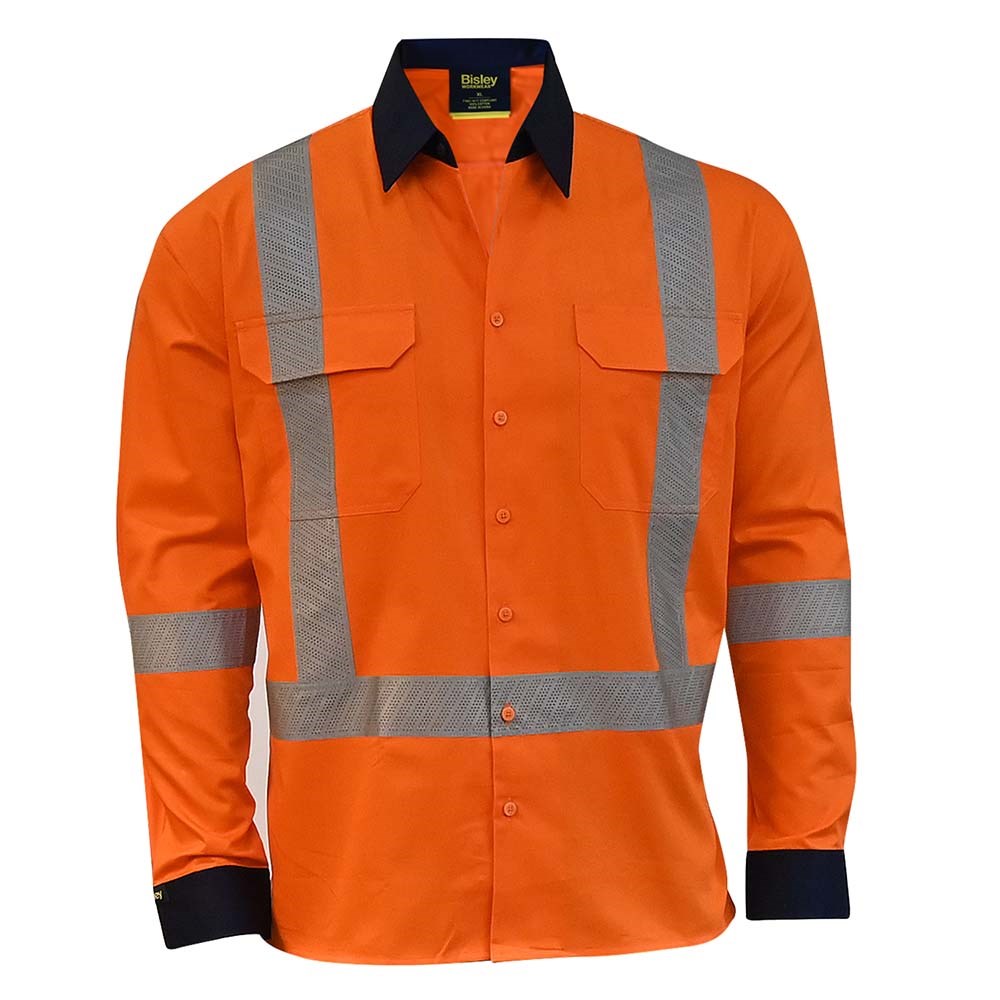 Bisley Mens Hi-Vis X Taped TTMC Drill Shirt - Orange/Black