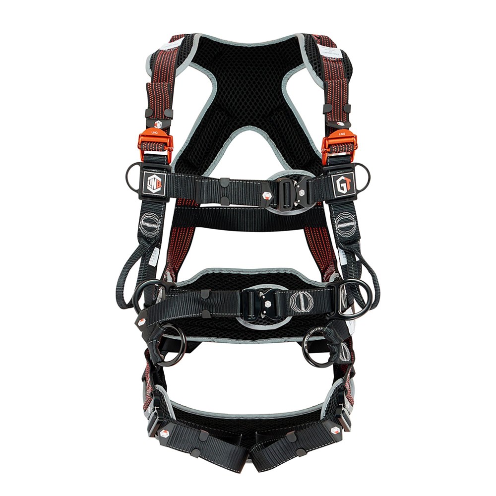 Sub Pelvic Strap integration along the line of Belay Loops, places the worker away from hardware in the event of a fall, significantly reducing the risk of injury from hardware hitting the worker.