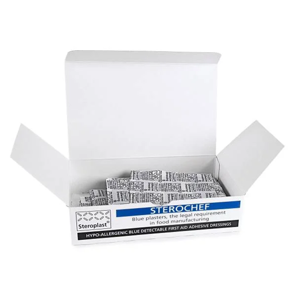 The Sterochef 7.5cm x 2.5cm plasters offer optimal coverage for larger cuts, ensuring a secure, hypoallergenic barrier in busy food preparation areas.