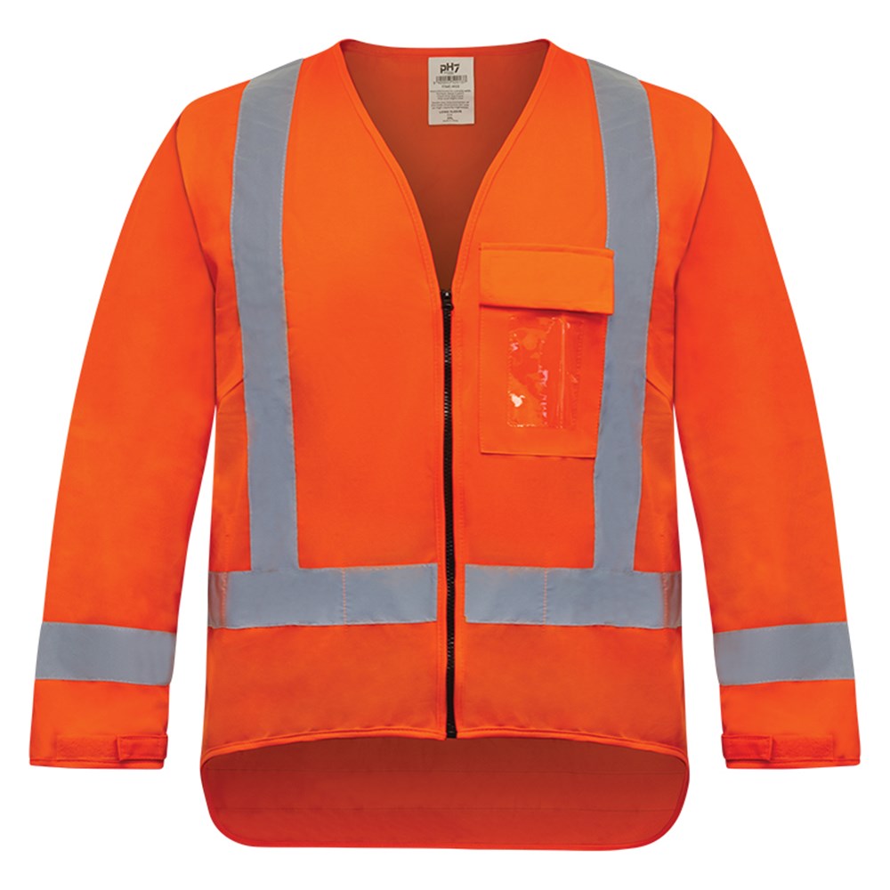 High visibility vest in fluorescent orange with an extra-long tail and additional reflective tape.
